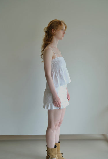 The Cora shorts are inspired by the carefree image of a girl joyfully playing beneath the blue sky, running through endless green meadows. With a playful smile-shaped hem and soft frill details, these shorts embody the spirit of youthful happiness.