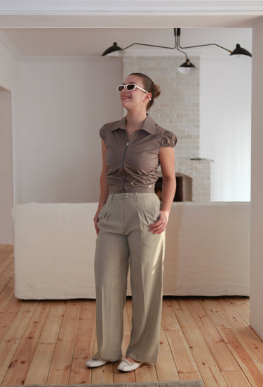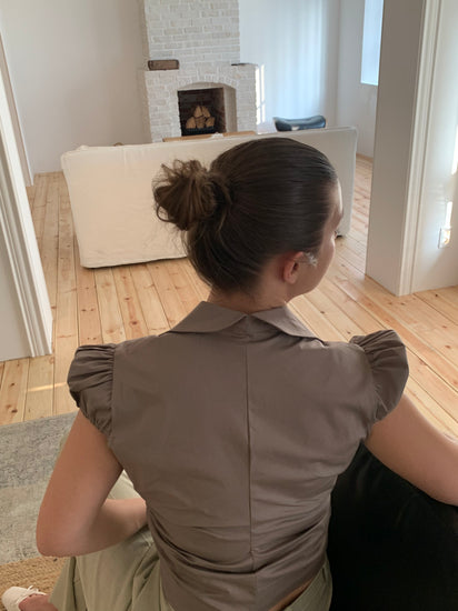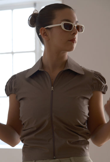 This zip-up blouse stands out with its bubbly banded puff sleeves and flattering fit.
